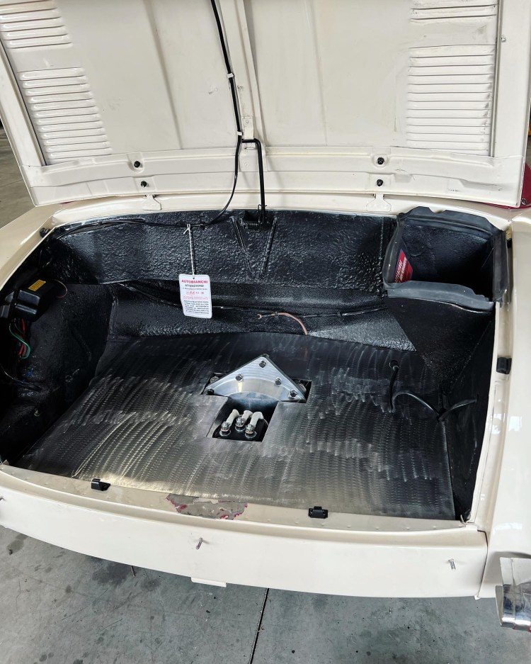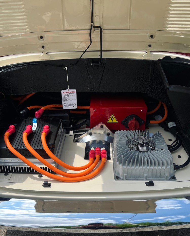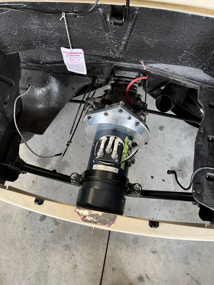 Underneath, this project car was taken from a 500 CC Fiat Engine to a now HPEVS AC-20 motor paired with a Curtis 1238/SE controller, powered by 3 Tesla Model S modules each with 5.3 Kilowatt hours (KWH). The motor was sourced from Thunderstruck Motors, utilizing their DC-DC converter, on-board charger, and dilithium battery management system (BMS). We used the factory manual transmission with an adaptor plate and kept the flywheel and clutch for ease of shifting. The purpose of the Autobianchi conversion was to make it an even better city cruiser, and we couldn’t be happier with the results.