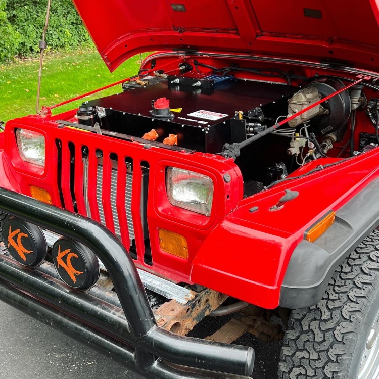 The Jeep was converted from its original 2.5L 4cyl to a 100 volt Nominal Hyper 9 with an SME X1 Controller mated to the factory AX5 manual transmission still utilizing a clutch. Powering the Jeep is two packs of 5 Tesla Model S battery modules wired in parallel, creating a 53 Kilowatt hour battery bank with the dilithium battery management system. Drew used an Elcon DC-DC converter and a Thunderstruck Motors on-board charger with a J-1772 Charge Port. He also installed the Thunderstruck Motors MCU Display that shows state of charge percentage, current battery voltage, amperage leaving the battery pack and amperage being put back in during regenerative braking, battery temperature, and the average individual cell voltage. The Jeep has roughly 130 HP and 175 Ft/lbs of torque and ranges 130 miles on a full charge.